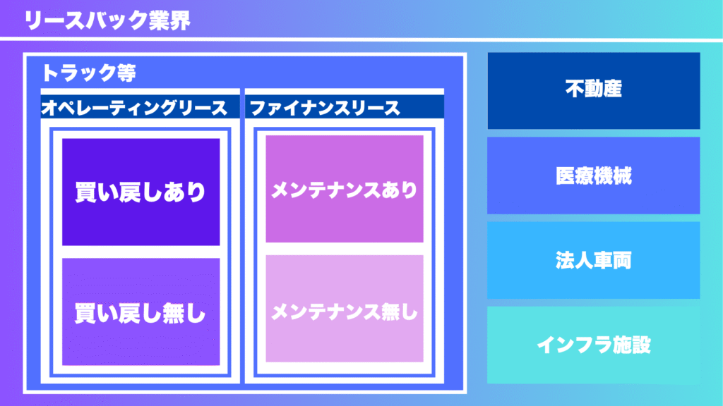 - 動産リースバック:トラックや法人車両、医療機器、工場設備など